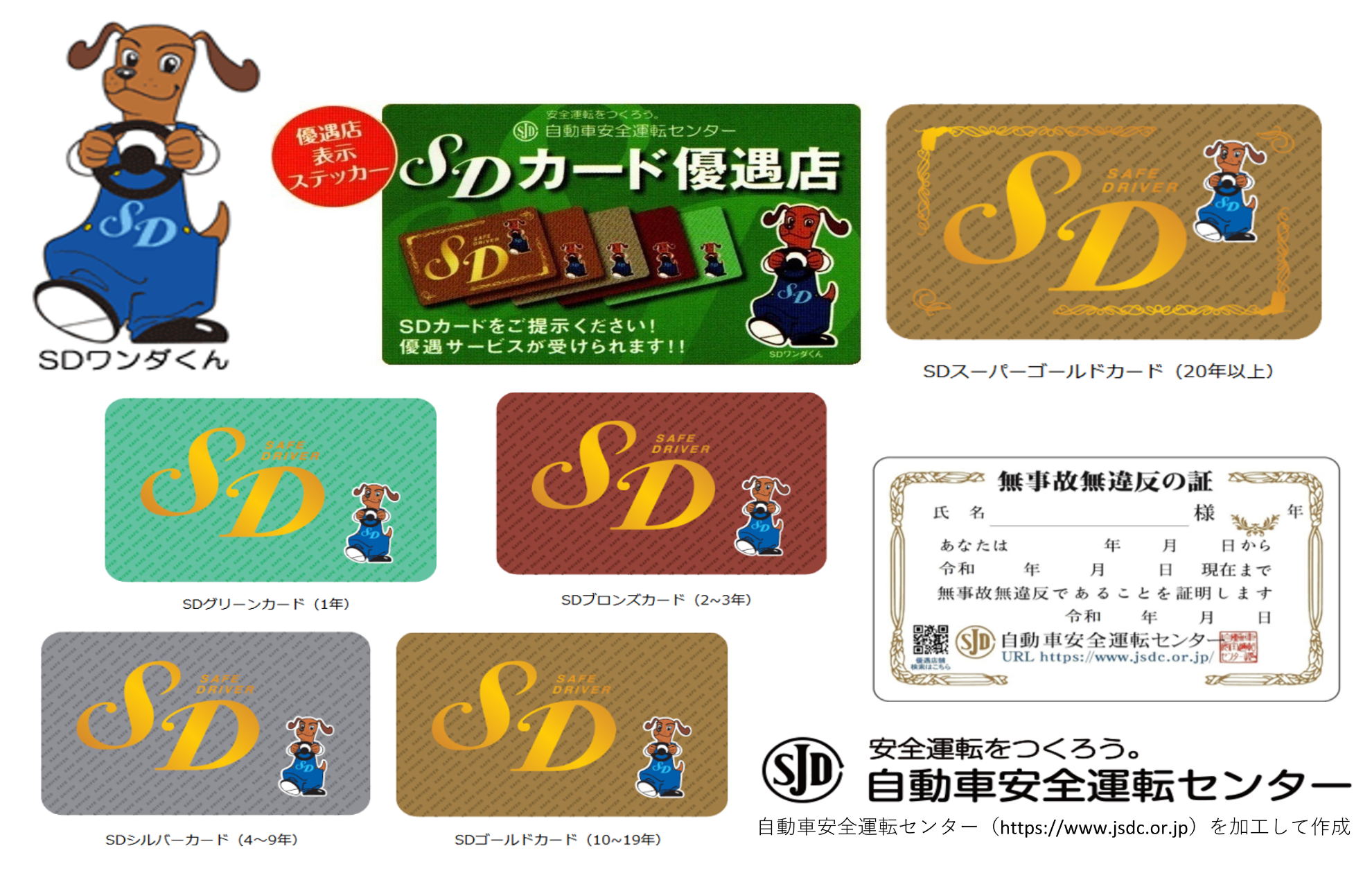 SDカードとは、「安全運転者(Safe・Driver)」であることを示すカードで自動車安全運転センターが発行しています。特典としてSDカード優遇店でガソリン代、食事代、宿泊費、マイカーローンの金利優遇など、さまざまな割引が受けられます。無事故・無違反の期間によって、5種類のSDカードがあります。